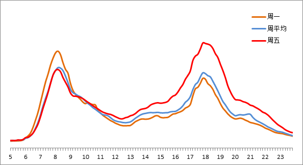 (二)工作日早晚高峰城区通行压力大,周一早高峰、周五晚高峰尤为突出,持续时间长于其他工作日