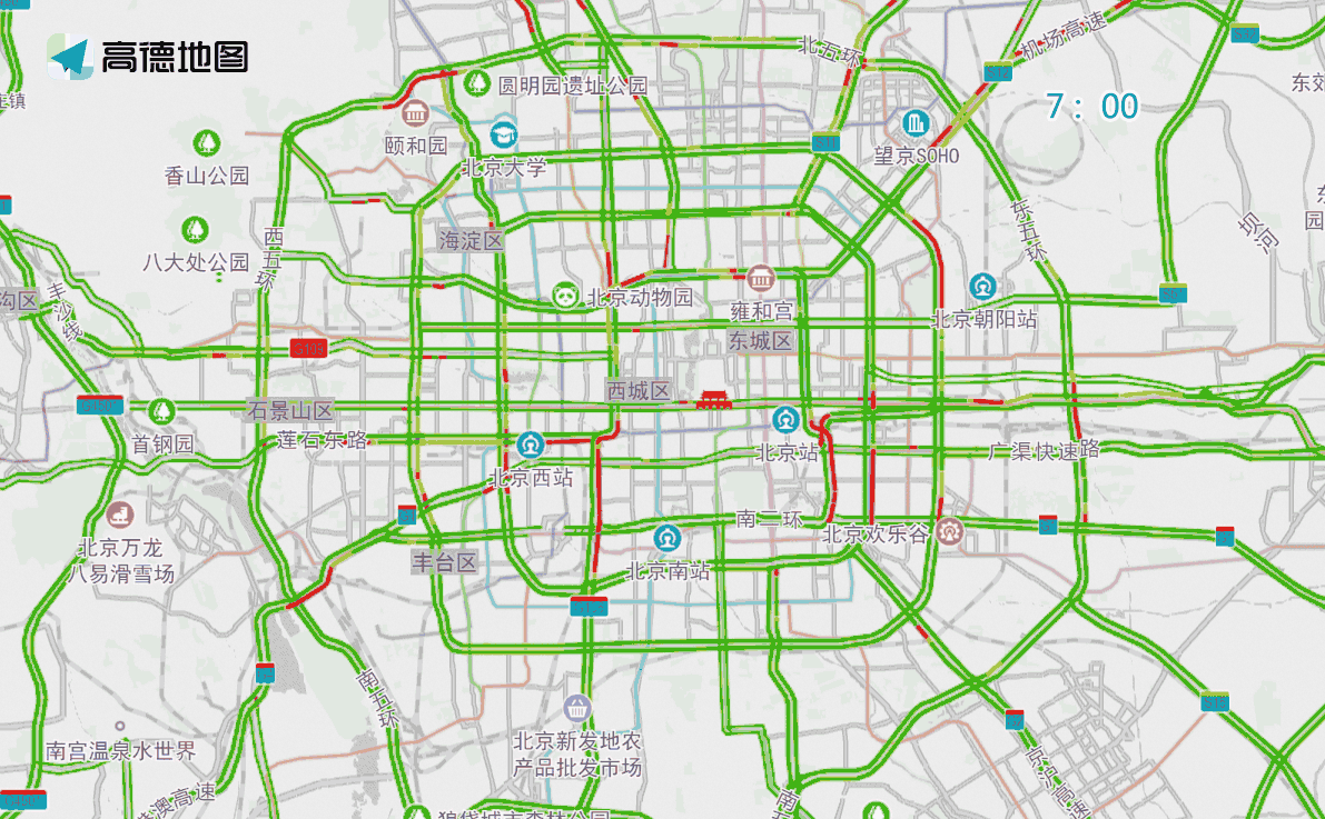 早高峰期间,二、三、四环,东、西、北五环,东、北六环,菜户营南路、通惠河北路、西直门北大街、德胜门外大街、圆明园西路至万泉河路、阜石路、莲石东路等道路进城方向将出现车行缓慢的情况;京藏高速、京承高速、京通快速、京港澳高速、机场高速等将出现进京潮汐车流,高峰时段为7:30至9:00。