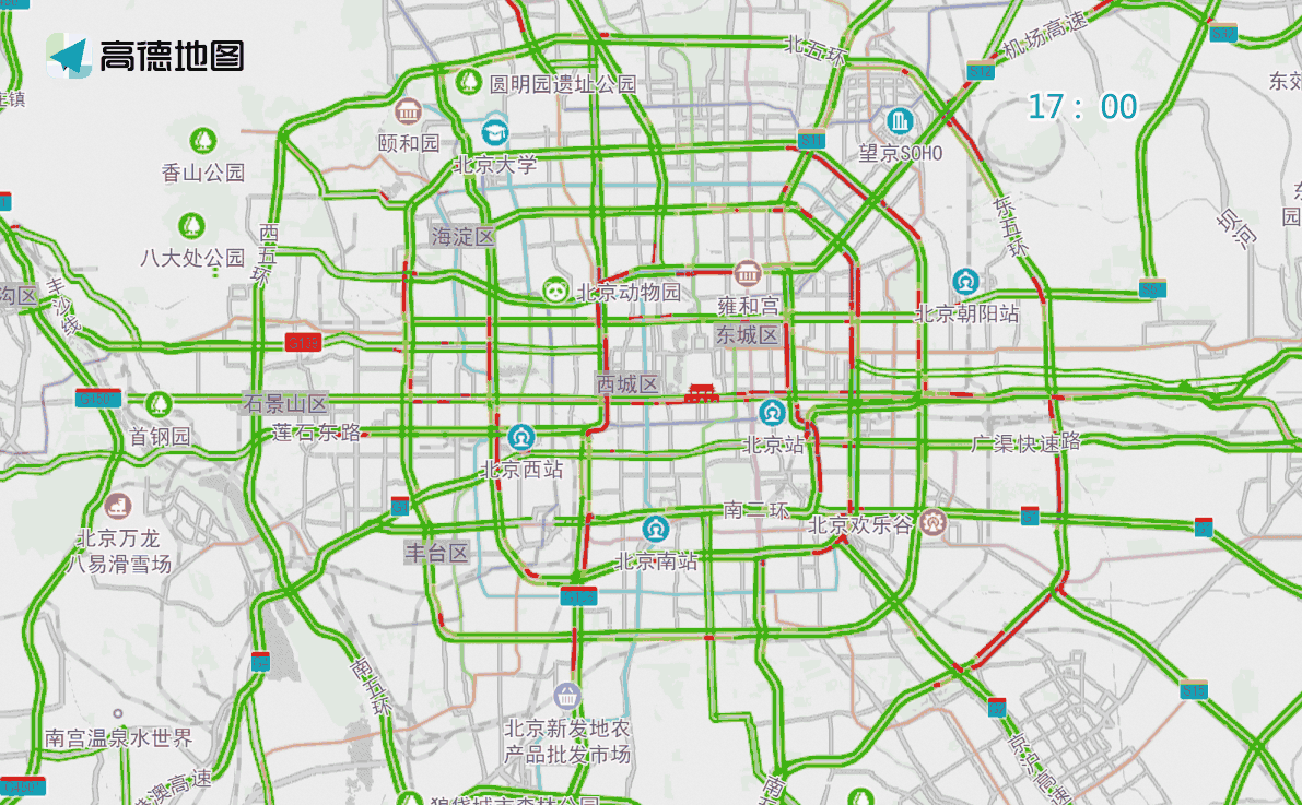 晚高峰期间,东、西、北二、三、四、五环,东六环部分路段,以及万泉河路至圆明园西路、通惠河北路、莲石东路等城区道路出城方向车流集中,京藏高速、京承高速、京通快速、京港澳高速、机场高速等高速公路出京方向将出现潮汐车流,高峰时段为17:00—19:00,周五晚高峰提前且持续时间较长。