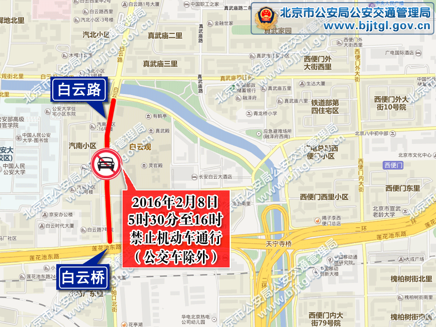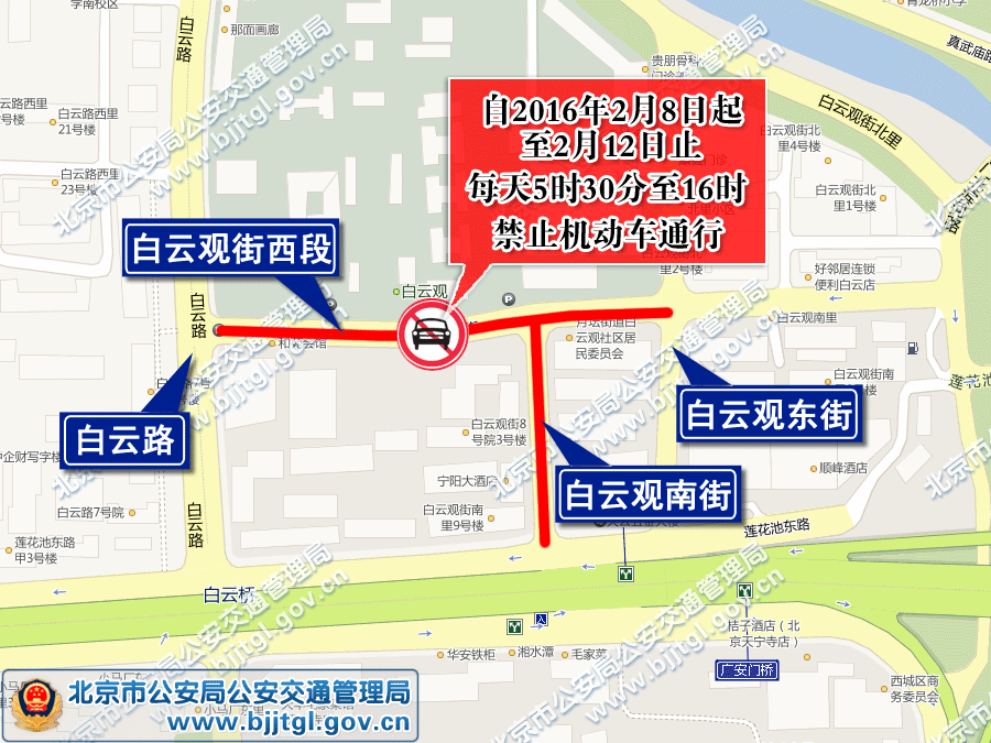 二、自2016年2月8日起至2月12日止,每天5时30分至16时,白云观街西段(白云路至白云观东街)和白云观南街禁止机动车通行。