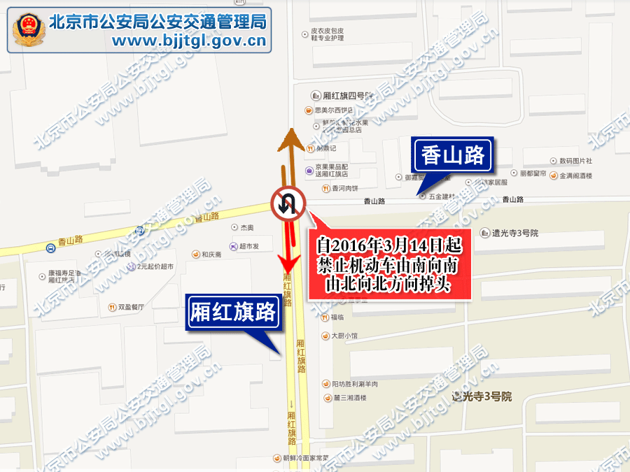 为保证厢红旗路与香山路的交通安全与畅通,根据《中华人民共和国道路交通安全法》的有关规定,决定自2016年3月14日起,厢红旗路与香山路相交路口禁止机动车由南向南和由北向北方向掉头。
