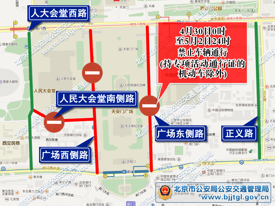 4月30日0时至5月2日24时,广场东侧路、广场西侧路、人大会堂西路(人民大会堂南侧路段)禁止车辆通行(持专项活动通行证的机动车除外),过往车辆(含公共电、汽车)绕行正义路和人大会堂西路。