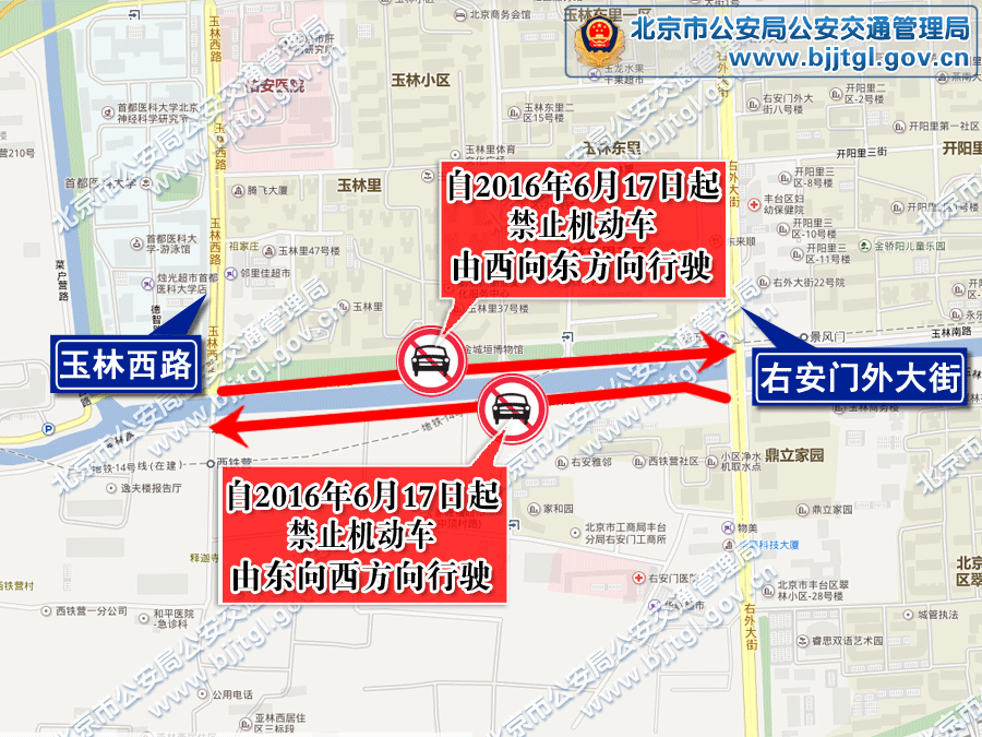 一、凉水河北巡河路(右安门外大街至玉林西路之间路段)禁止机动车由西向东方向行驶;