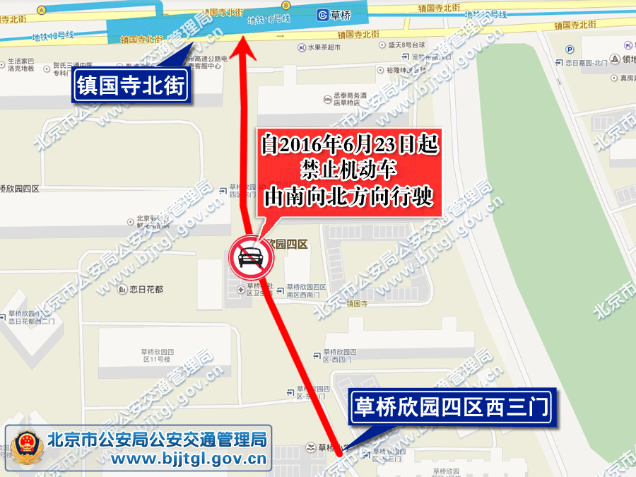 为保证丰台区草桥社区文化中心西侧路的交通安全与畅通,根据《中华人民共和国道路交通安全法》的有关规定,决定自2016年6月23日起,草桥社区文化中心西侧路(镇国寺北街至草桥欣园四区西三门之间路段)禁止机动车由南向北方向行驶。