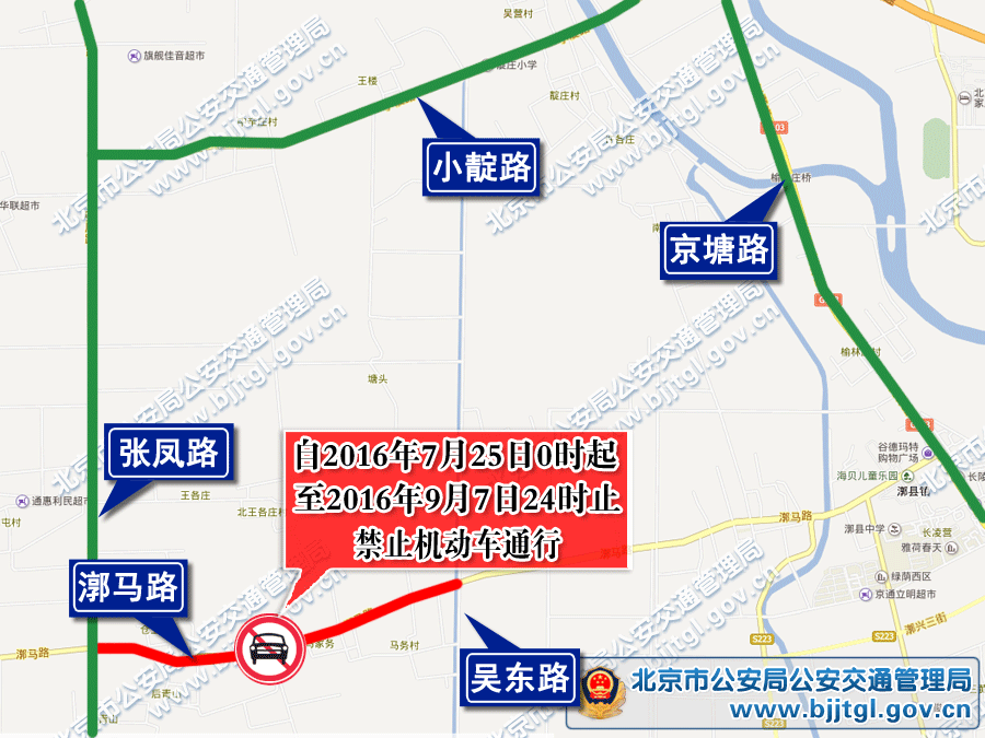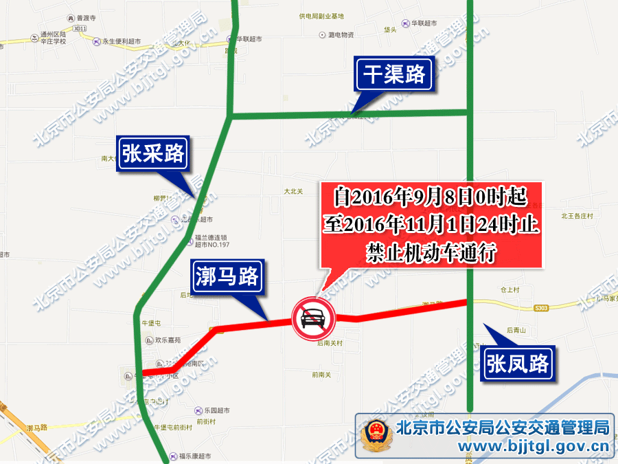 自2016年9月8日0时起至11月1日24时止,通州区漷马路K5+920至K9+520段(张凤路青山路口至张采路牛堡屯路口)禁止机动车通行,机动车可绕行张凤路、干渠路、张采路。