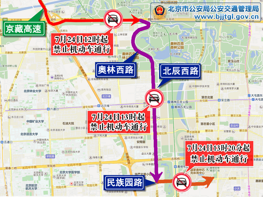 2.13时起,经奥林西路、奥林西路与科荟路交叉口(含)、北辰西路与科荟南路交叉口(含)、北辰西路与大屯北路交叉口(含)、北辰西路与大屯路交叉口(含)、北辰西路与国家体育场北路交叉口(含)、北辰西路与慧忠路交叉口(含)、北辰西桥、北辰西路与民族园路交叉口(不含)机动车道,禁止机动车通行。社会车辆可绕行北四环路、北土城西路、裕民路、北三环路行驶。