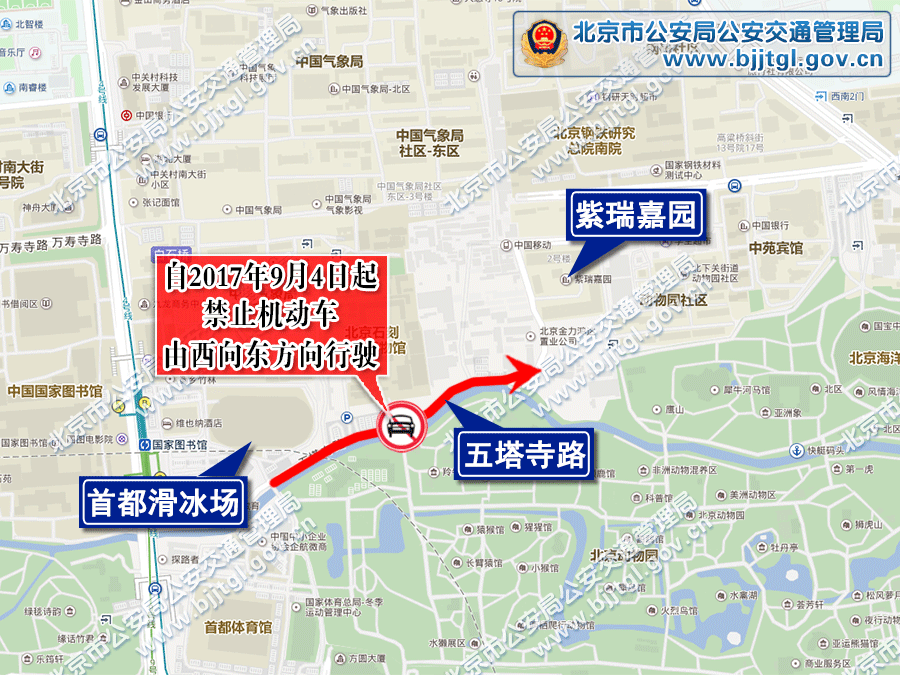 一是五塔寺路东段(紫瑞嘉园西侧路南口至首都滑冰场南门段)禁止机动车由西向东方向行驶;