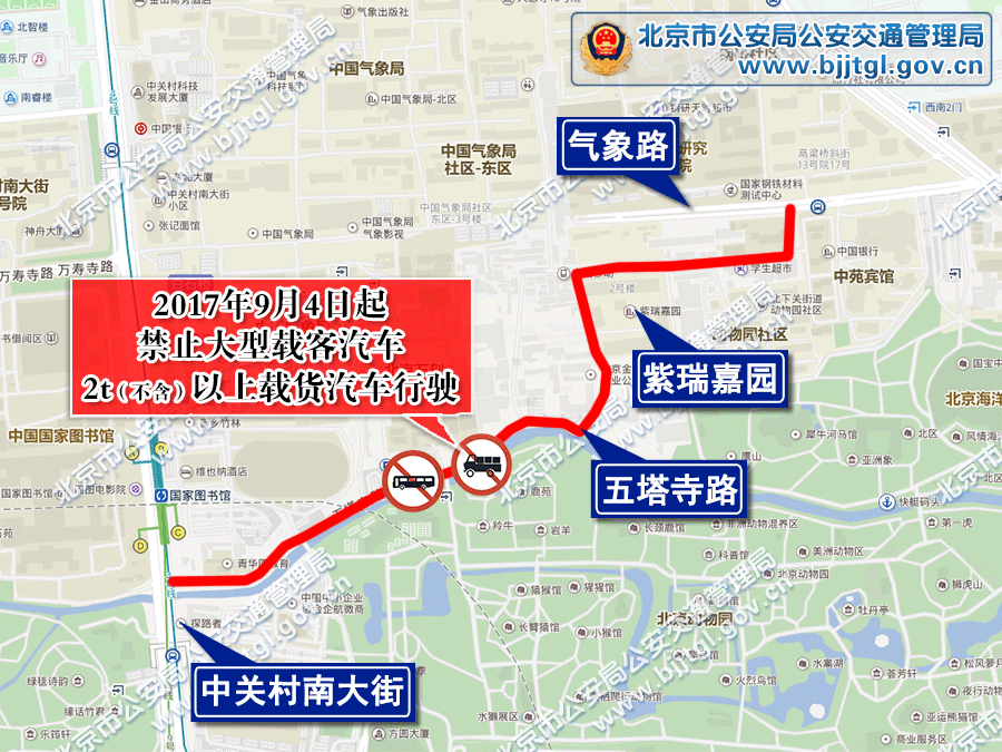 二是五塔寺路(中关村南大街至紫瑞嘉园西侧路段)、紫瑞嘉园西侧路(五塔寺路至紫瑞嘉园北侧路段)、紫瑞嘉园北侧路(紫瑞嘉园西侧路至农科院附小学东侧路段)、农科院附属小学东侧路(紫瑞嘉园北侧路至气象路段)禁止大型载客汽车及2t(不含)以上载货汽车行驶。