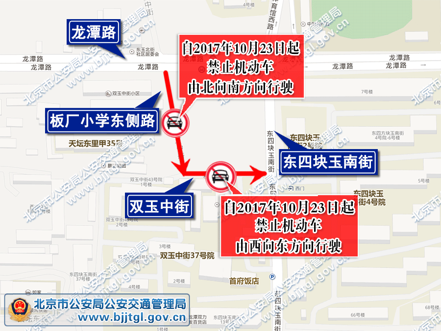 为保证东城区板厂小学东侧路、双玉中街东段的交通安全与畅通,根据《中华人民共和国道路交通安全法》的有关规定,决定自2017年10月23日起,对板厂小学东侧路、双玉中街东段采取以下交通管理措施: