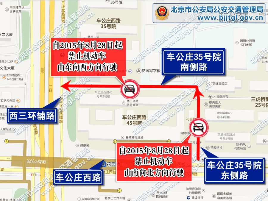 一、车公庄35号院南侧路(西三环辅路至车公庄35号院东侧路)禁止机动车由东向西方向行驶;