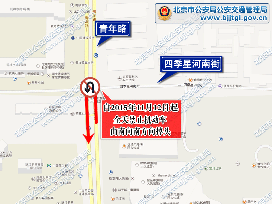 为保证朝阳区青年路四季星河南街路口的交通安全与畅通,根据《中华人民共和国道路交通安全法》的有关规定,决定自2015年11月12日起,朝阳区青年路四季星河南街路口,全天禁止机动车由南向南方向掉头。