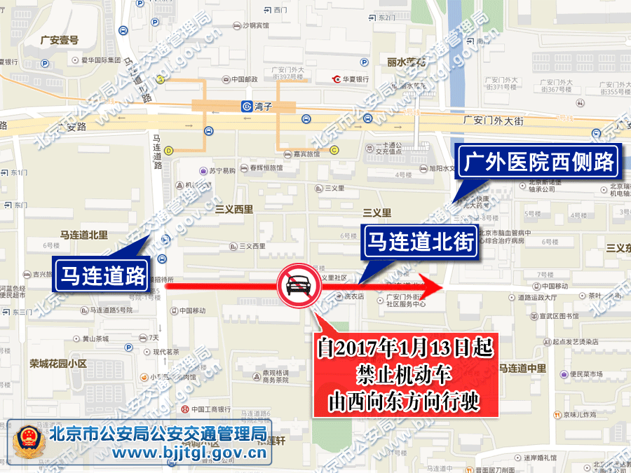 为保证西城区马连道北街的交通安全与畅通,根据《中华人民共和国道路交通安全法》的有关规定,决定自2017年1月13日起,马连道北街(广外医院西侧路至马连道路之间路段)禁止机动车由西向东方向行驶。
