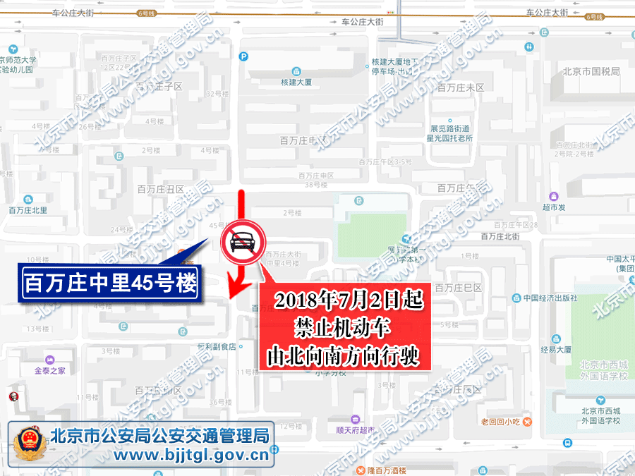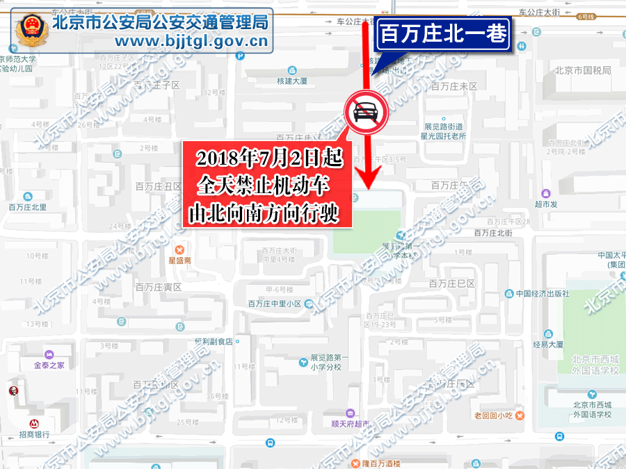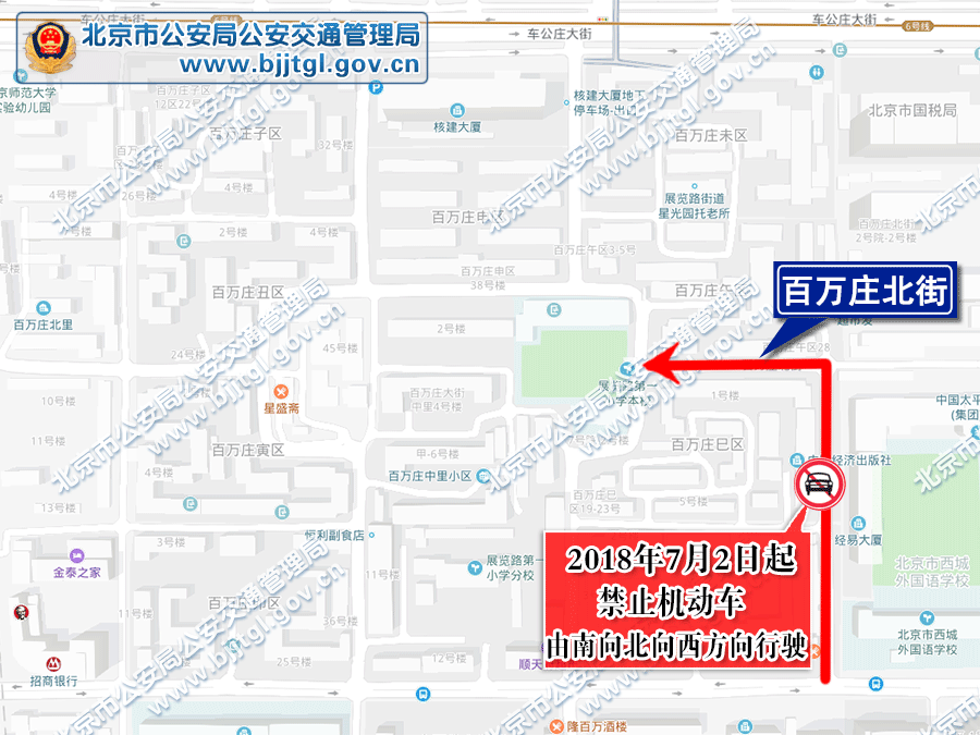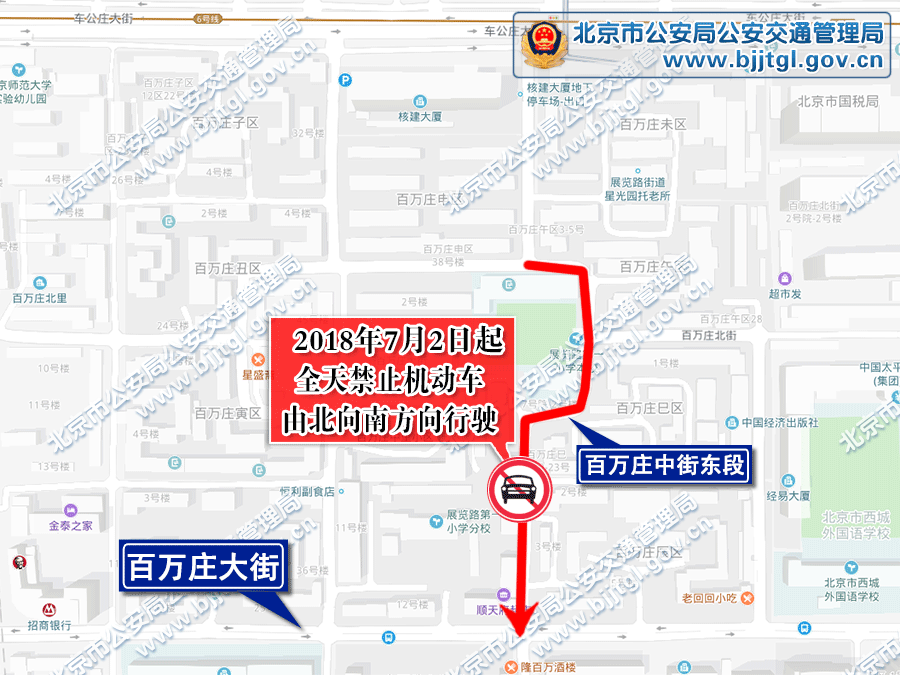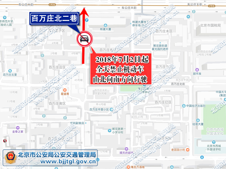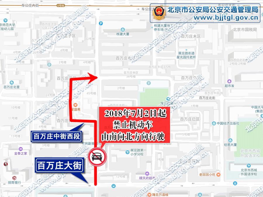 为保证西城区百万庄地区的交通安全与畅通,根据《中华人民共和国道路交通安全法》的有关规定,决定自2018年7月2日起,对百万庄地区部分道路采取以下交通管理措施: