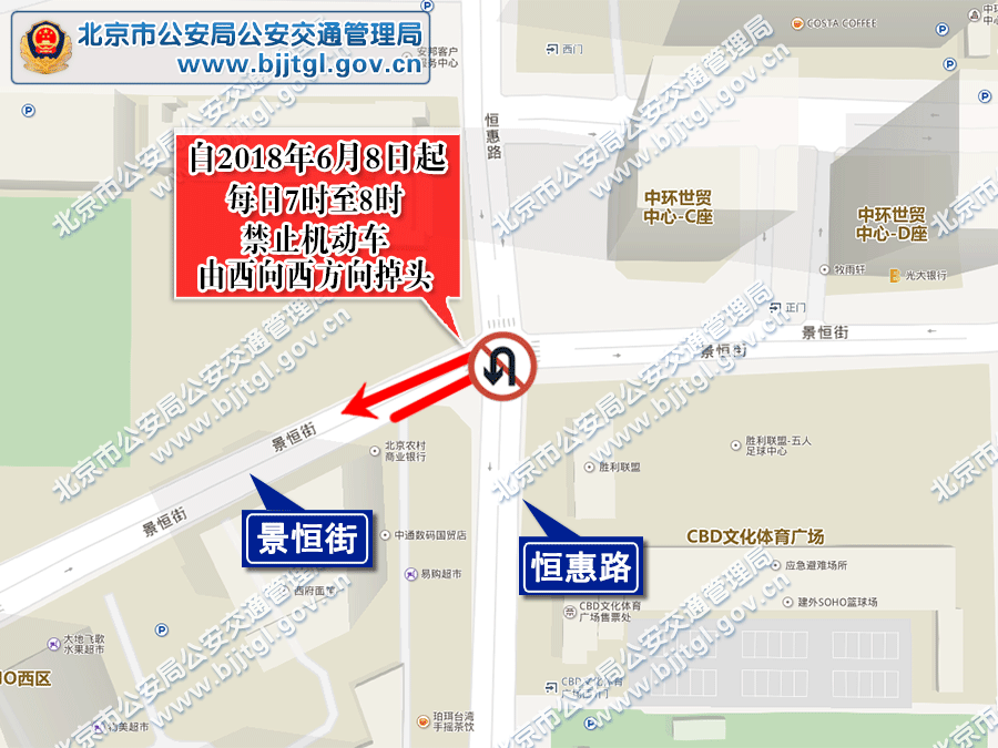 为保证朝阳区恒惠路与景恒街相交路口的交通安全与畅通,根据《中华人民共和国道路交通安全法》的有关规定,决定自2018年6月8日起,朝阳区恒惠路与景恒街相交路口每日7时至8时,禁止机动车由西向西方向掉头。
