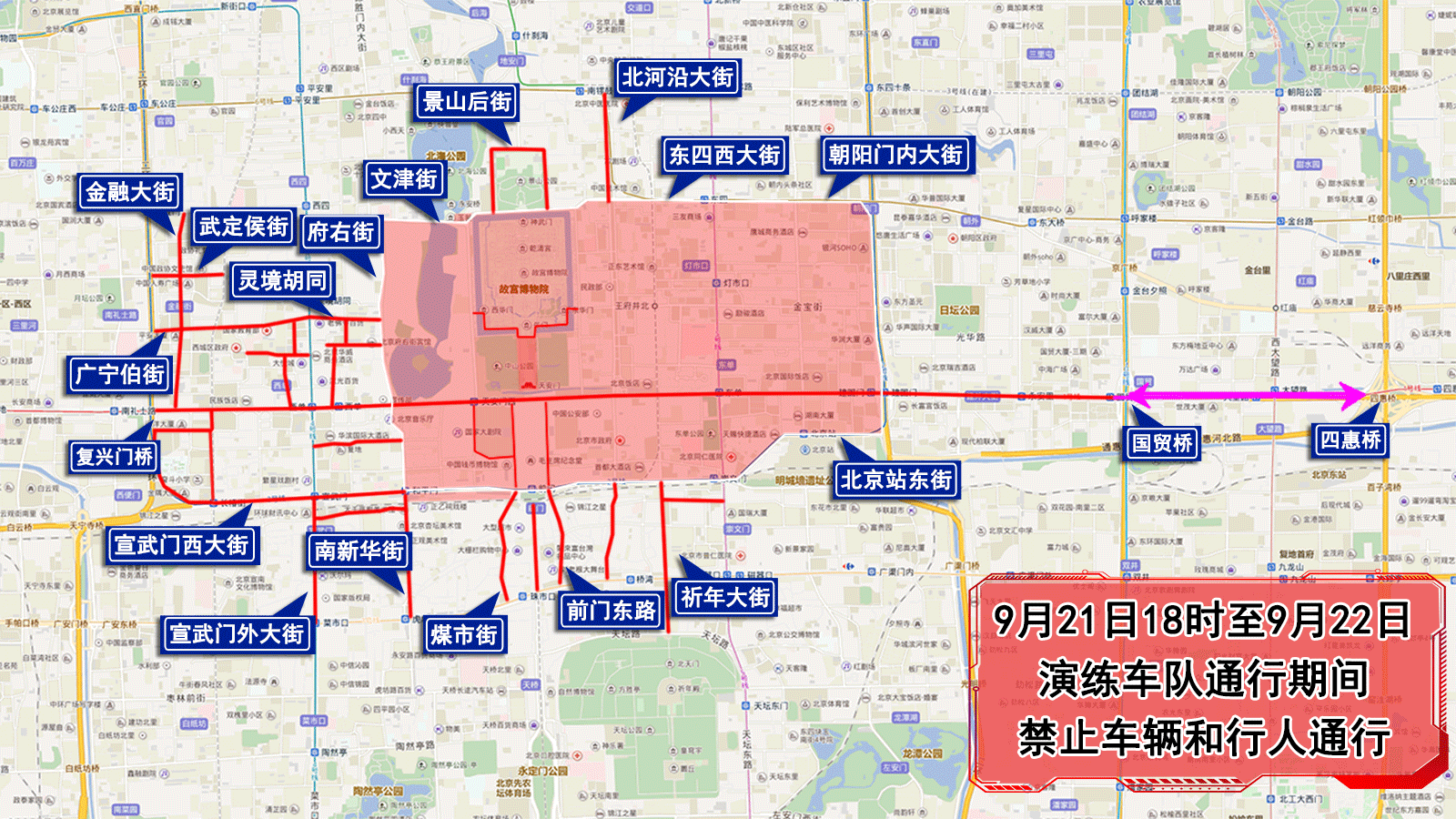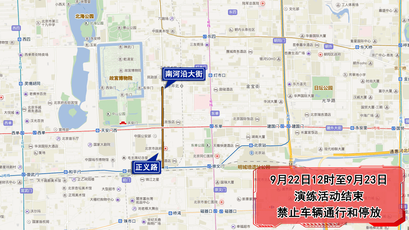 三、9月21日12时30分至9月22日演练活动结束,南池子大街、南河沿大街、王府井西街、东单北大街、朝阳门南小街、正义路、台基厂大街、崇文门内大街、北京站街,除持有演练活动专用证件的车辆外,禁止其他车辆通行和停放。