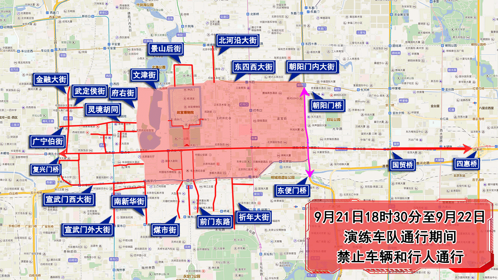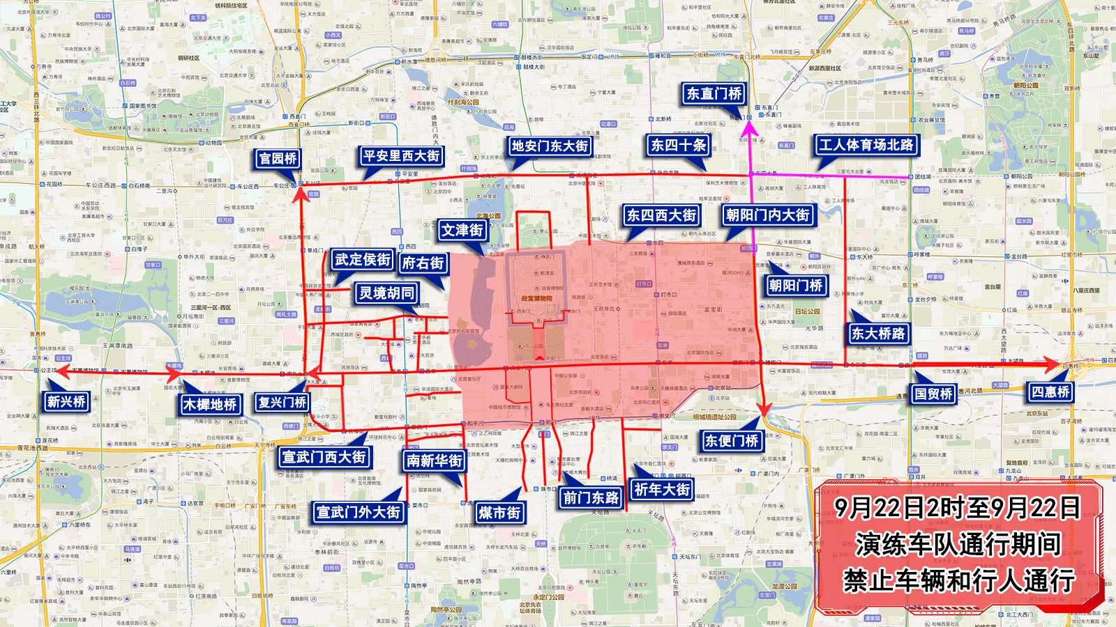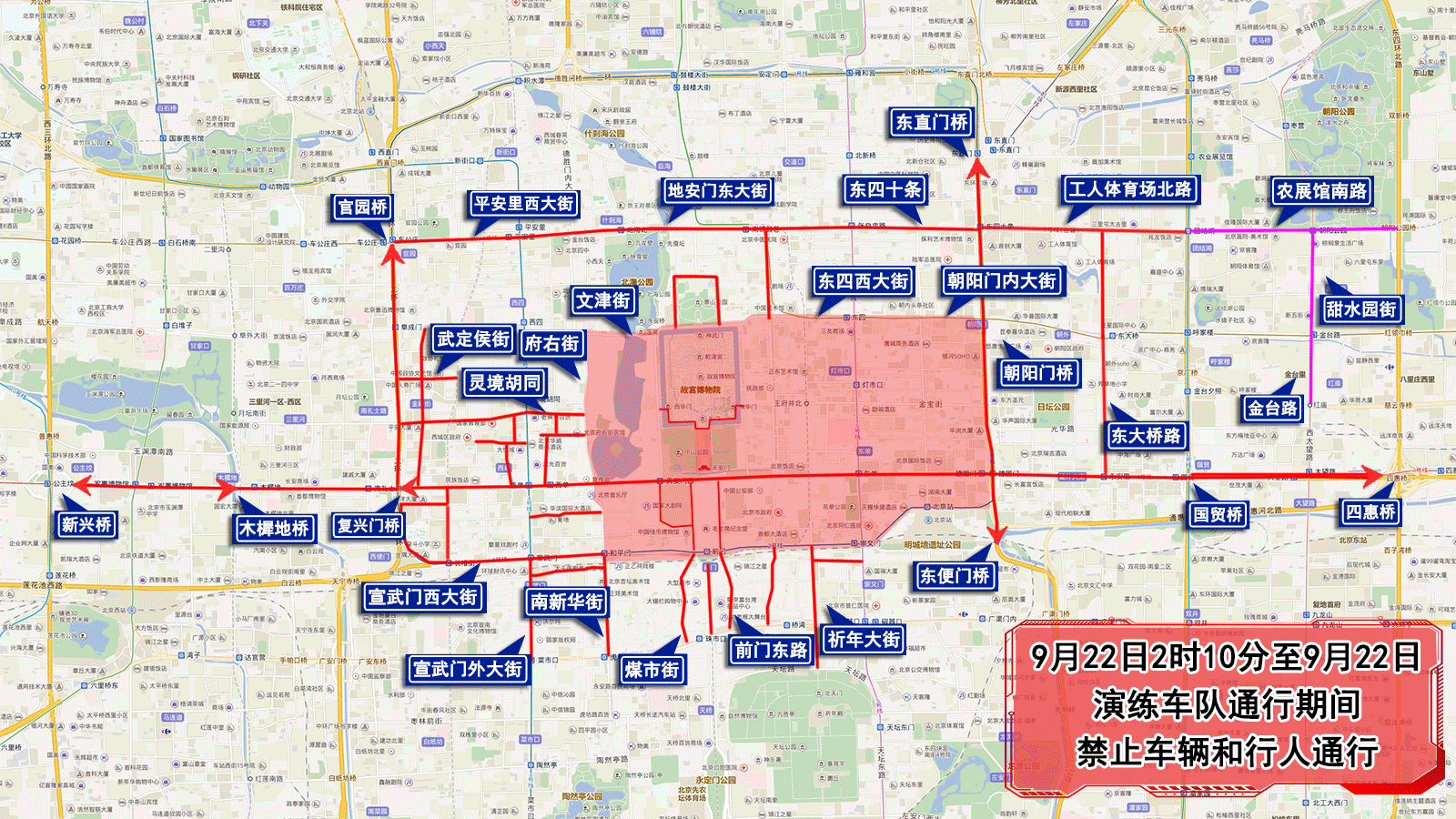 十三、9月22日1时40分至9月22日演练车队通行期间,平安里西大街;地安门西大街;地安门东大街;张自忠路;东四十条,除持有演练活动专用证件的车辆和人员外,禁止其他车辆和行人通行。