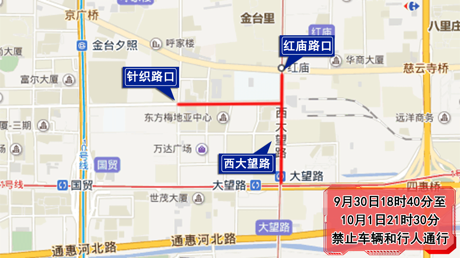 五、9月30日18时40分至10月1日21时30分,西大望路由红庙路口(不含)至大望桥(不含),光华路由针织路口(不含)至光华路东口,除持有庆祝活动专用证件的车辆和人员外,禁止其他车辆和行人通行。